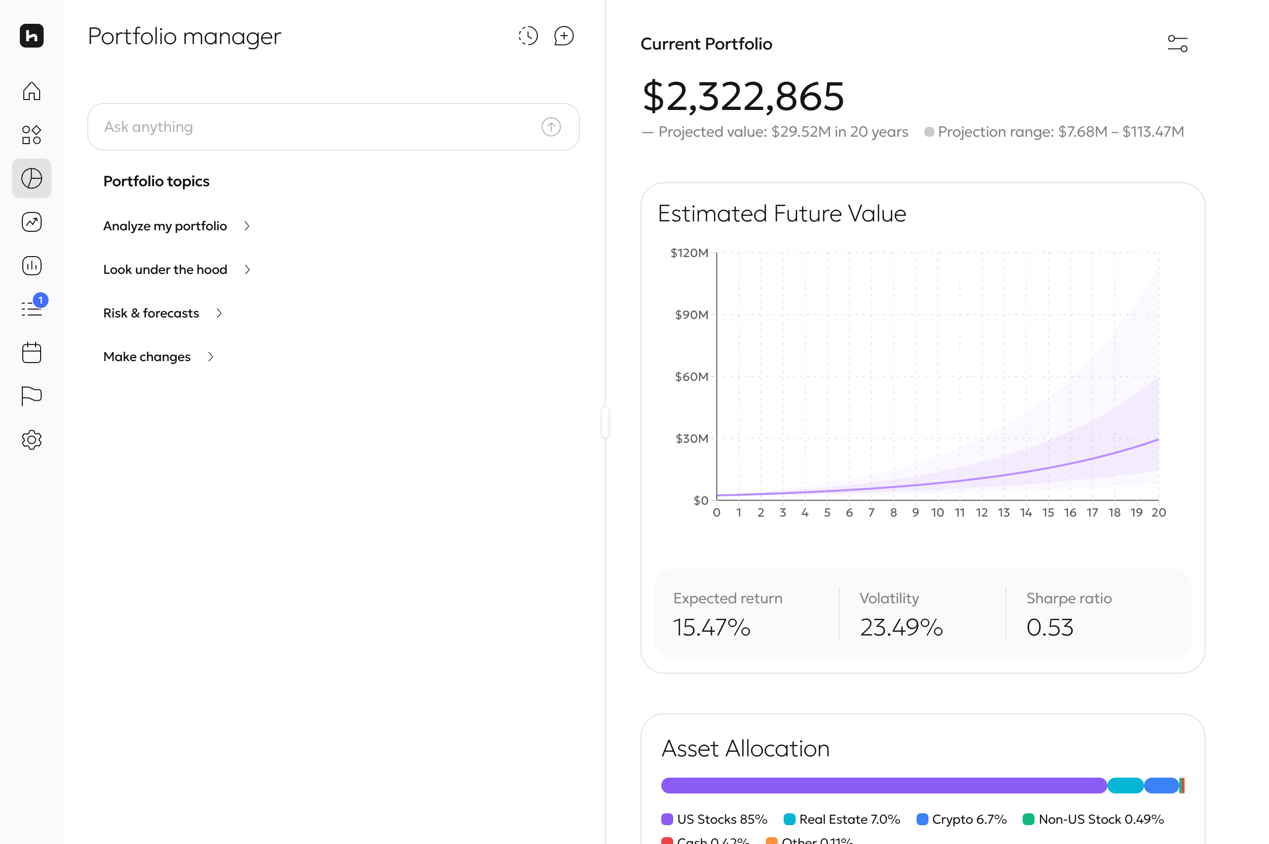 Checking in on your net worth is often the number one thing that people want to do on a somewhat frequent basis. As humans, we just want to know what that number is and whether it is moving up or down. We want to know why. The portfolio tab is designed to help you understand that. We are still in early days, so we don’t have advanced tools like backtesting and sensitivity analysis, but those are coming. If you’re excited about this, give it a go, tell us what we’re missing and we’ll build it.